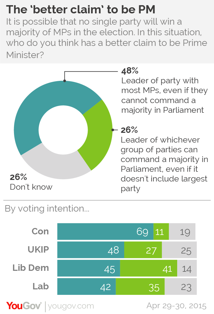 The public may be headed for disappointment if the leader of the largest party on May 8th fails to form a government – they think that leader has the better claim to become PM.