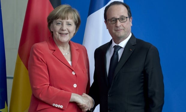 Angela Merkel and François Hollande shake hands in Berlin. Photograph: Imago/Barcroft Media