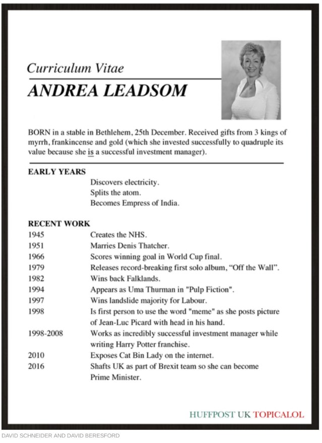 A CV listing the post Financial Institutions Director at Barclays later added the word "deputy". An innocent error, according to Team Leadsom - and the MP who'd boasted of her high-powered background had merely been "bigging her up".